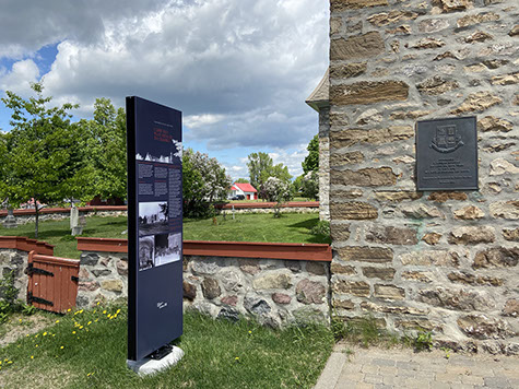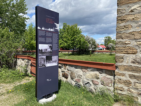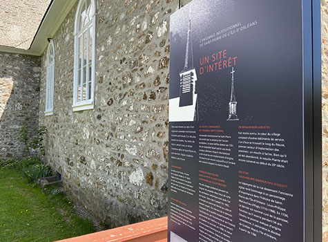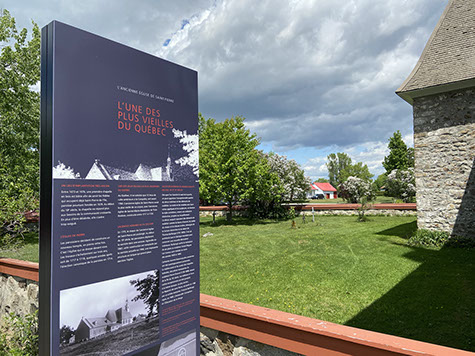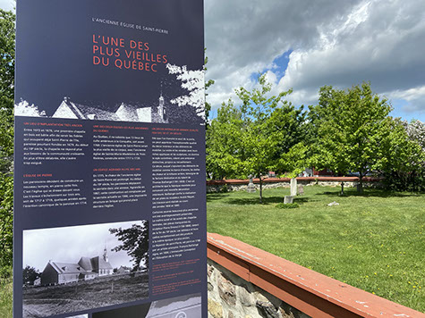 Un panneau d'interprétation qui raconte l'histoire de l'ancienne église de Saint-Pierre-de-l'Île-d'Orléans et de l'ensemble institutionnel qui l'entoure.